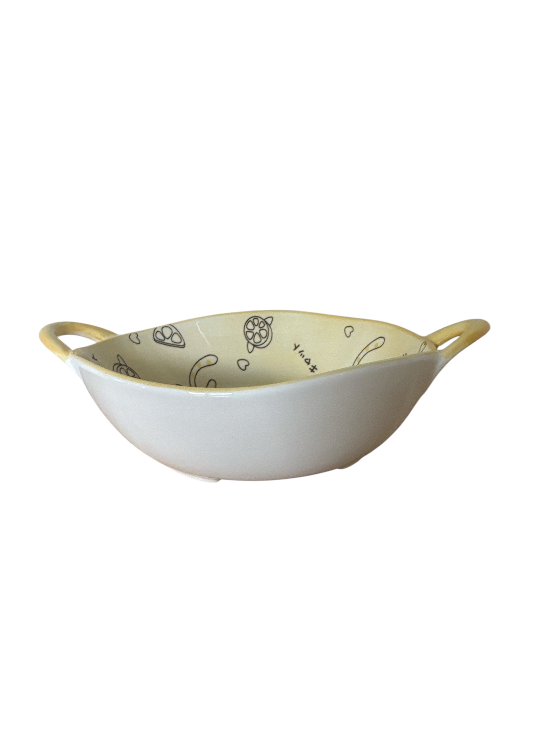 This charming yellow bowl features a delightful cat design and subtle Japanese lettering, evoking a fresh summer vibe. Crafted with convenient handles and accompanied by a matching spoon, it blends playful aesthetics with practical functionality—perfect for adding a touch of kawaii elegance to your table.